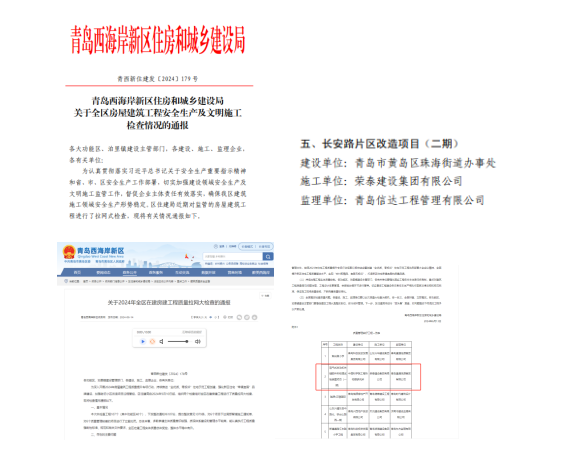 近期,青岛西海岸新区住房和城乡建设局印发了《关于全区房屋建筑工程安全生产及文明施工检查情况的通报》,荣泰建设集团在建项目:长安路片区改造项目(二期)、吸气式发动机关键部件热物理试验装置项目(一期)获得通报表扬。