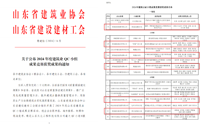 6月26日,由山东省建筑业协会开展的“2024年度建筑业QC小组成果竞赛”活动成绩公示,荣泰集团共获得6项QC小组成果奖项,其中,一等奖1项,二等奖3项,三等奖2项。并且荣泰集团隆海凯旋QC小组——创新一种超高层幕墙安装工程顶部安全硬防护方法,成功进入中国施工企业管理协会决赛。